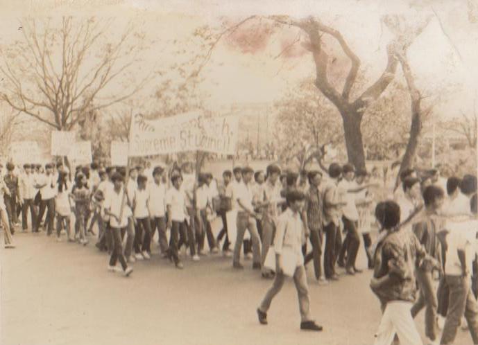 Protest by students of different colleges and universities including high school students on the non-admission or blacklisting of student activists in 17 colleges and universities on Dec. 4, 1970. The banner in the picture displays “PSHS Supreme Student Council”. Posted 11 Jul 2012 on the “Remember Francis Sontillano” Facebook page.